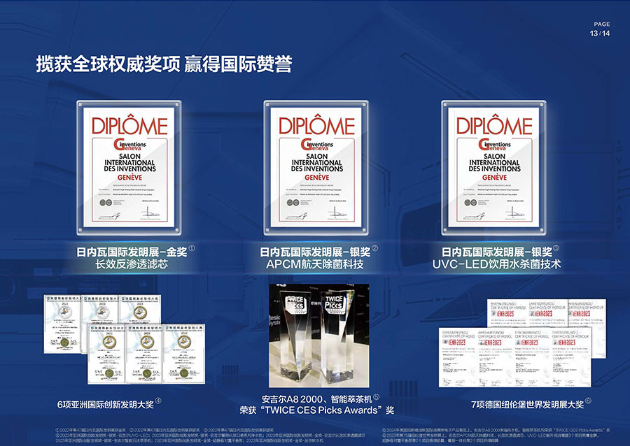 38年間,安吉爾堅(jiān)持科技創(chuàng)新并主導(dǎo)行業(yè)技術(shù)升級(jí),參與制定17項(xiàng)國(guó)家及行業(yè)標(biāo)準(zhǔn),獲得900余項(xiàng)技術(shù)專利,建成4大水質(zhì)實(shí)驗(yàn)室。2023年,該企業(yè)憑借創(chuàng)新實(shí)力包攬全球9項(xiàng)發(fā)明大獎(jiǎng),包括3項(xiàng)日內(nèi)瓦國(guó)際發(fā)明展獎(jiǎng)項(xiàng)與6項(xiàng)亞洲創(chuàng)新發(fā)明展獎(jiǎng)項(xiàng)。