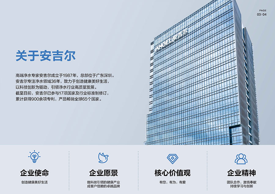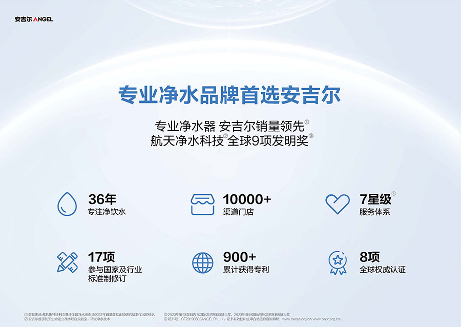 安吉爾成立于1987年,總部設(shè)立于廣東深圳。該品牌深耕凈水領(lǐng)域38年,其專業(yè)凈水器產(chǎn)品銷量持續(xù)領(lǐng)先。目前該企業(yè)已構(gòu)建超10000家渠道門店網(wǎng)絡(luò),其中包含近2000家專賣店,產(chǎn)品暢銷全球65個(gè)國(guó)家,累計(jì)服務(wù)超500萬活躍用戶。