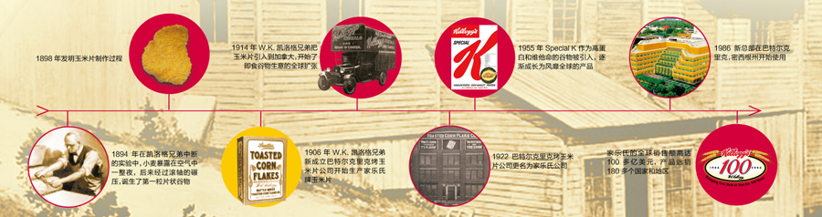 一百多年來,家樂氏公司秉承“更健康、更營養(yǎng)美味和更高質(zhì)量”的信念以及“天然和優(yōu)質(zhì)”的高尚品質(zhì),不斷地推陳出新,先后推出系列經(jīng)典 產(chǎn)品如All-Bran®(1916年)和 Rice Krispies®(1928年)。隨著業(yè)務的發(fā)展,家樂氏公司開始拓展國際業(yè)務:1914年Kellogg’s Corn Flakes®產(chǎn)品進軍加拿大市場,1924年和1938年分別在澳大利亞的悉尼、英格蘭的曼徹斯特設立工廠。2007年,家樂氏成功進入中國,并以銷售額接近120億美金的業(yè)績成為全球谷物食品和方便食品的領頭者,產(chǎn)品包括谷物類早餐、餅干、克力架、糕點、果味小食、燕麥餅干棒、冷凍華夫以及素食產(chǎn)品等。2012年6月,家樂氏在全球成功收購品客品牌,使家樂氏的休閑產(chǎn)品成為繼谷物產(chǎn)品之后的第二大品牌。