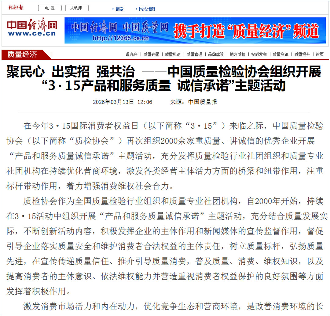 中國經濟網發(fā)布:質量誠信承諾 助力提振消費——中國質量檢驗協(xié)會組織2000余家優(yōu)秀企業(yè)開展2026年3·15“產品和服務質量誠信承諾”主題活動