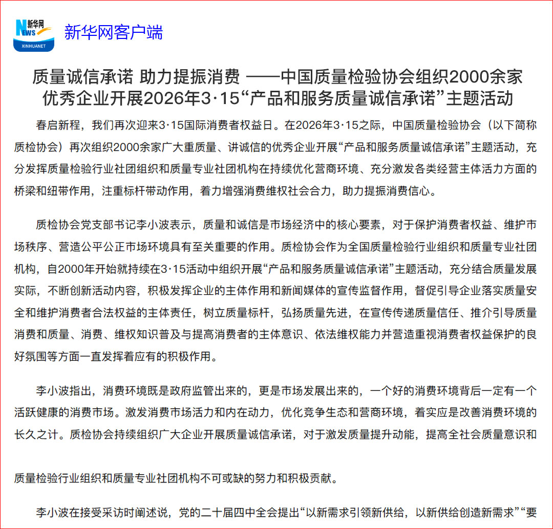 新華網報道:質量誠信承諾 助力提振消費——中國質量檢驗協(xié)會組織2000余家優(yōu)秀企業(yè)開展2026年3·15“產品和服務質量誠信承諾”主題活動