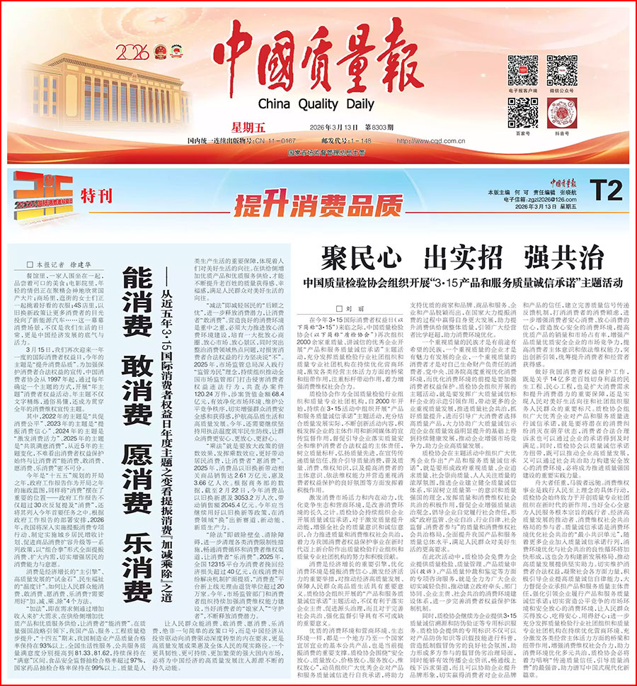 《中國消費者報》(2026年3月15日刊)發(fā)布:中國質量檢驗協(xié)會關于組織開展全國質量檢驗穩(wěn)定合格產品(2023-2026年度)調查匯總和質量信譽承諾公告宣傳工作的公告(中國質量檢驗協(xié)會公告·2026年第3號)