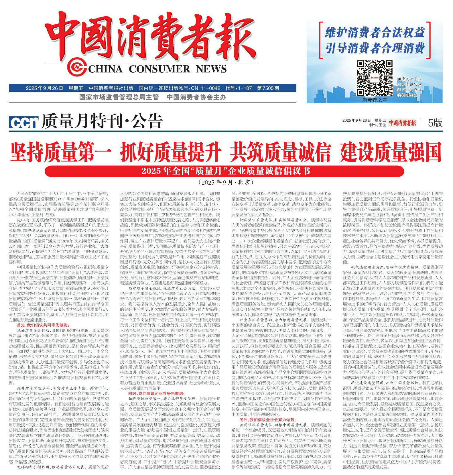 - 《中國質(zhì)量報(bào)》(2025年9月26日刊)發(fā)布:堅(jiān)持質(zhì)量第一 抓好質(zhì)量提升 共筑質(zhì)量誠信 建設(shè)質(zhì)量強(qiáng)國——2025年全國“質(zhì)量月”企業(yè)質(zhì)量誠信倡議書(2025年9月·北京)
